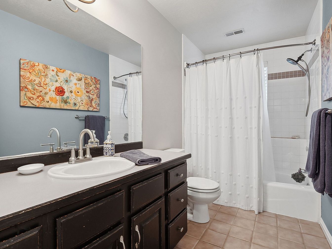 This bathroom features a dark wood vanity with multiple storage drawers and a large white countertop complementing a modern white oval sink. Brushed nickel fixtures add a touch of elegance. The walls blend soft grey and blue tones that enhance the calming atmosphere, while a large mirror above the sink opens up the space visually. A colorful floral art piece brings a warm, vibrant accent to the otherwise neutral room. The tiled floor is a warm beige color. The bathtub-shower combo is enclosed with a white curtain, highlighted by clean white tile and a strip of decorative accent tiles near the top. Dark towels contrast neatly against the muted wall colors, completing the balanced aesthetic.