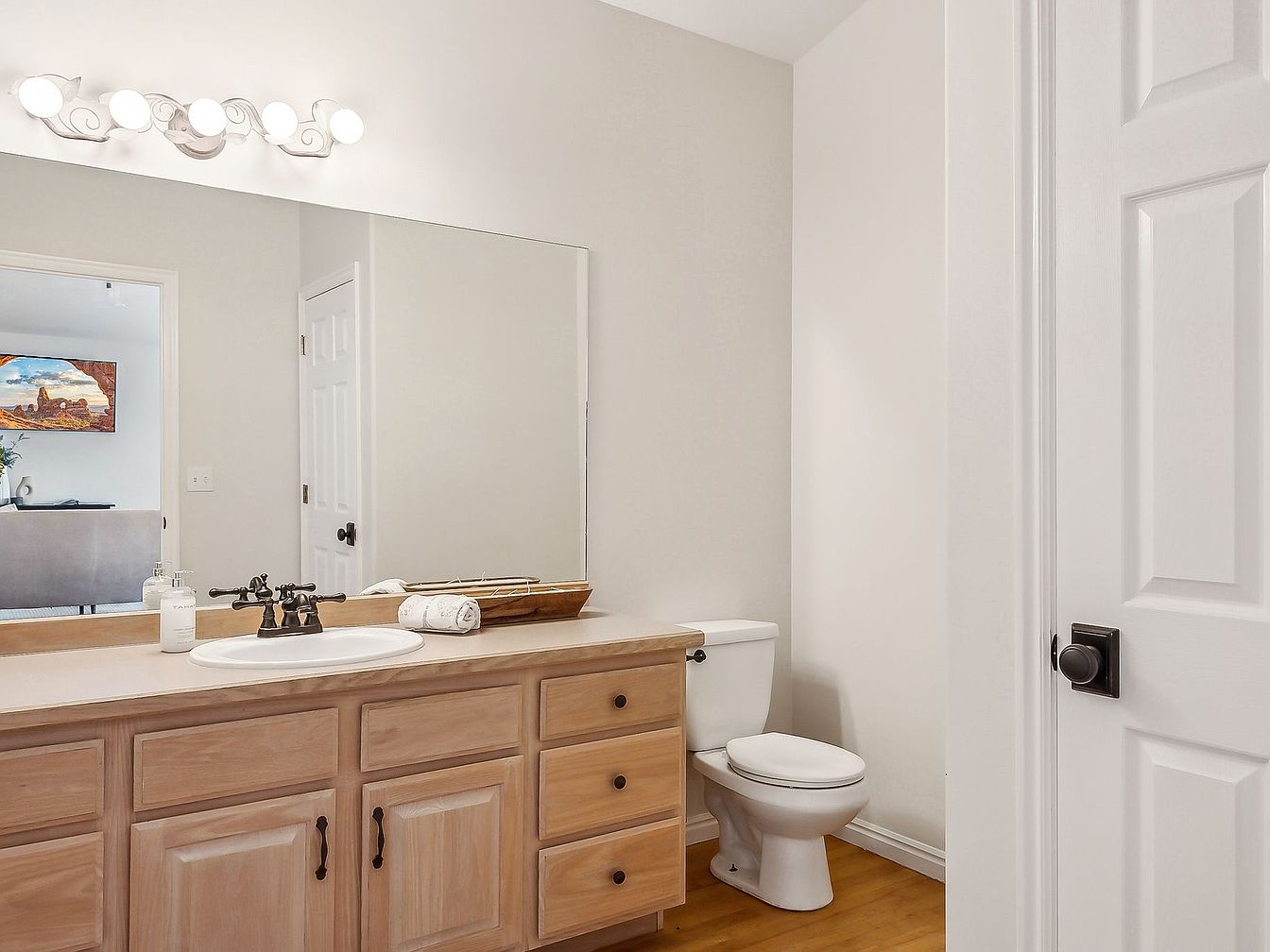 This bathroom space features a natural wood vanity with multiple storage drawers and cabinets, topped with a beige countertop that holds a round white sink with dark bronze faucet fixtures. Above the vanity, a large frameless mirror spans the wall, reflecting light and creating an open feel. The room’s walls are painted a soft off-white, contributing to the bright, clean aesthetic. A white porcelain toilet is positioned next to the vanity, and the flooring consists of warm-toned hardwood, adding warmth to the otherwise neutral palette. Modern, decorative lighting with round bulbs adds a classic touch above the mirror.
