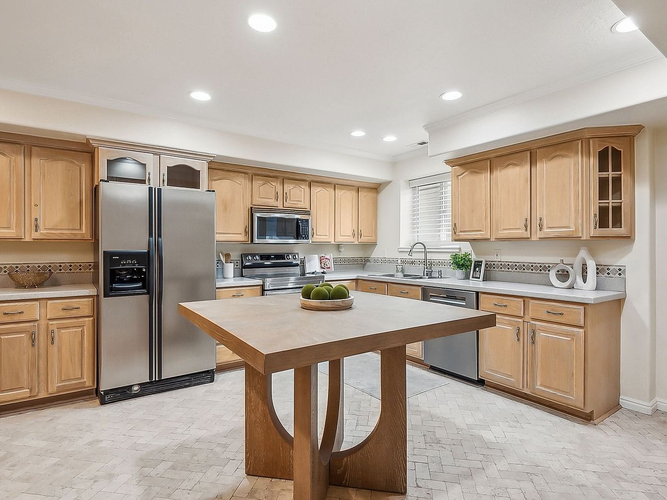 This kitchen features a spacious and functional layout centered around a sturdy wooden island with a unique geometric base, providing both workspace and an aesthetic focal point. Surrounding the island, light wood cabinetry with classic raised panel doors lines the walls, complemented by neutral countertops and a tiled backsplash with diamond accents that add subtle elegance. Stainless steel appliances, including a double-door refrigerator, microwave, stove, and dishwasher, offer modern convenience. The color palette blends warm wood tones with soft beige and cream hues, enhanced by recessed ceiling lights and a window above the sink that floods the space with natural light.