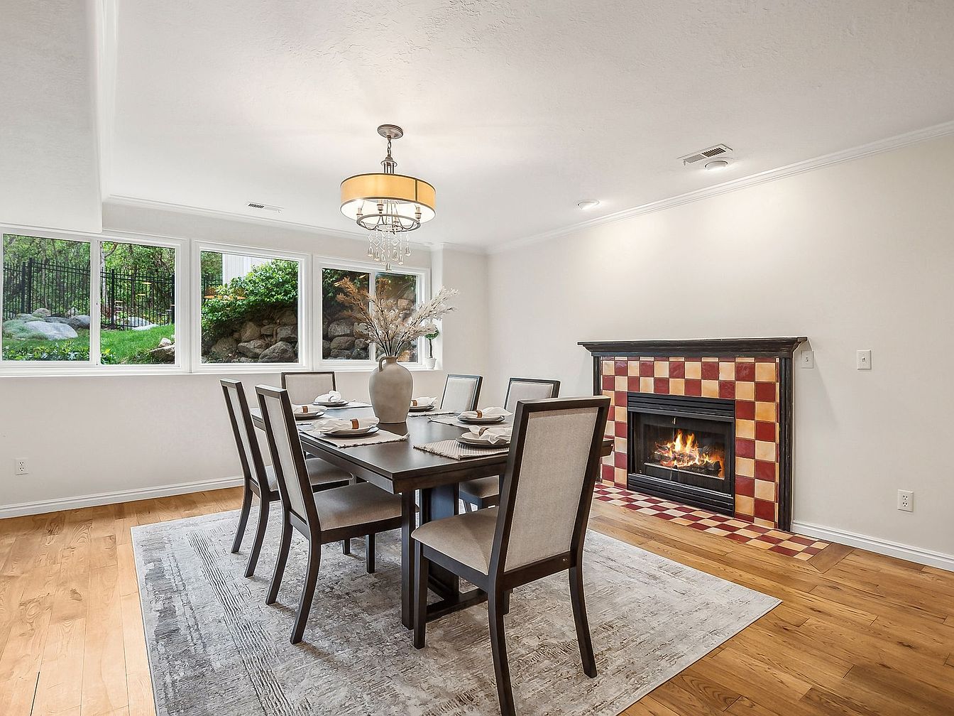 This dining room boasts a warm, inviting atmosphere with a medium-toned hardwood floor and a large area rug anchoring the dark wood rectangular dining table and six cushioned chairs. The light beige upholstery on the chairs complements the neutral wall paint and enhances the room’s airy feel. A notable feature is the striking fireplace with a checkerboard tile surround in deep red and creamy yellow tones, adding a touch of vintage character. Natural light flows in through three wide windows overlooking a lush garden, while a classic drum chandelier with crystals elegantly illuminates the space.