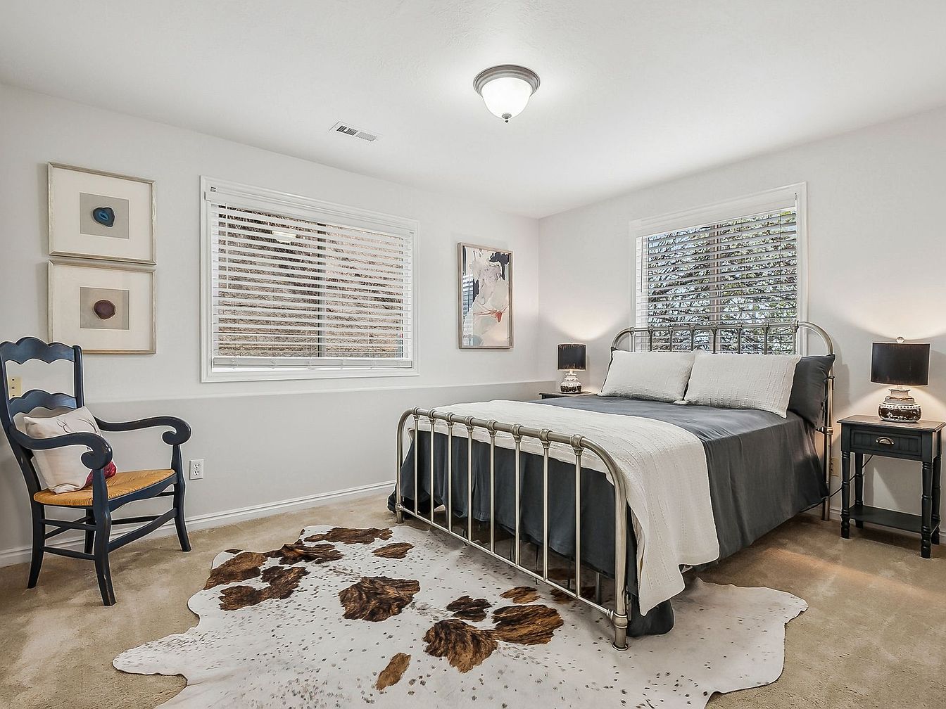 This bedroom embodies a calm, inviting atmosphere with soft neutral walls and beige carpeting. A metal-framed bed dressed in dark gray bedding and white accent pillows sits centered between two classic black nightstands, each topped with a matching lamp that features intricate detailing. Two large windows with white blinds allow natural light to filter in, brightening the room. An elegant cowhide rug with brown and white spots anchors the space, complementing the woven seat of a bold, black wooden chair in the corner. Minimal artwork enriches the walls with subtle color and texture.