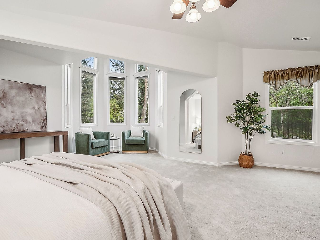 This master bedroom features a bright, airy sitting area framed by tall, narrow windows that stretch towards the ceiling, allowing natural light and lush greenery views inside. Soft neutral tones dominate the room, with light beige carpeting and white walls creating a serene backdrop. Two deep green upholstered armchairs flank a small round side table, positioned to take full advantage of the window views. A wooden console table with abstract art leans against the wall, adding warmth and texture. An arched wall mirror introduces subtle architectural interest, while natural touches like a potted plant enhance the calm, inviting atmosphere.