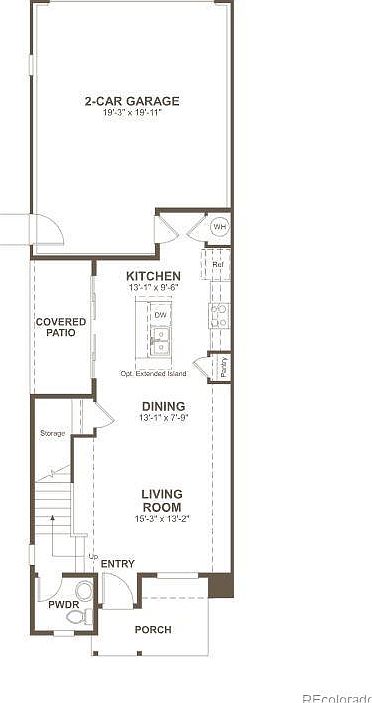 This floor plan features a well-organized open layout that prioritizes functionality and flow. The entrance opens into a spacious living room measuring 15’3″ by 13’2″, seamlessly connected to the dining area, which is 13’1″ by 7’9″. Adjacent to the dining space, the kitchen is compact but efficient with dimensions of 13’1″ by 9’6″, complete with an optional extended island for extra prep and seating space. A cozy powder room is conveniently located near the entry, while stairs to the upper level sit beside a small storage closet. Outdoor living is welcomed with a covered patio accessible from the kitchen area, and a two-car garage is attached at the rear for easy access.