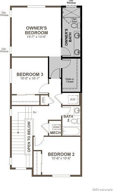 This floor plan highlights the residential sleeping quarters with three bedrooms. The owner’s bedroom spans 13’-7” by 13’-6” and includes an ensuite bathroom and a spacious walk-in closet, emphasizing privacy and convenience. Bedroom 2 and Bedroom 3 provide well-sized personal spaces next to a shared second bathroom. The layout incorporates practical storage with a linen closet adjacent to the hall. Central stairs open to below, bringing vertical openness. The washer and dryer are tucked into a dedicated nook, maintaining a clean and organized living environment, while mechanical and HVAC spaces are efficiently positioned for utility access.