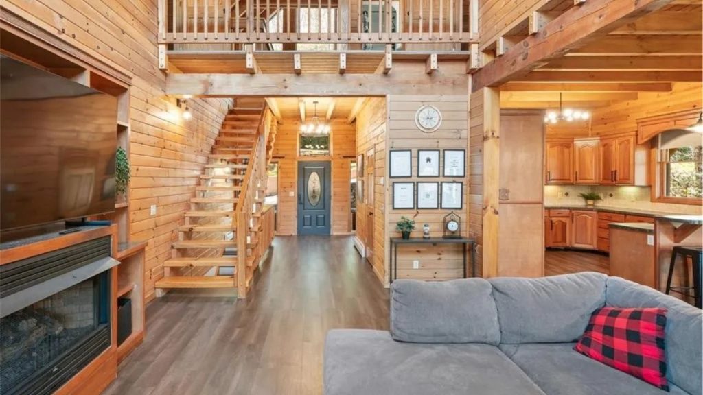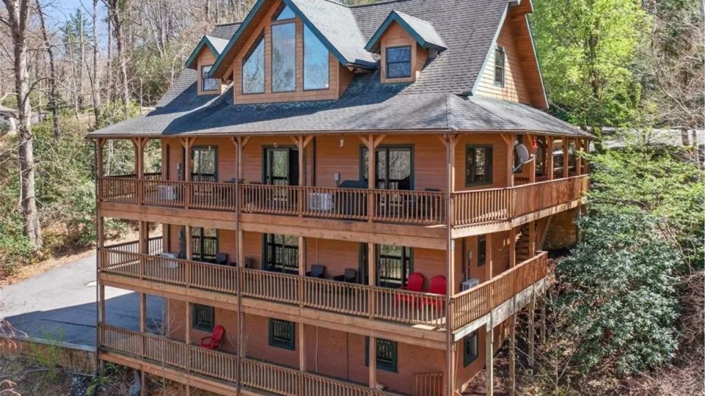 This three-story mountain lodge blends rustic craftsmanship with cozy sophistication. Its natural wood exterior and wraparound porches on each level create a seamless connection to the surrounding forest. A-frame windows bring in abundant sunlight, while the pitched roof and exposed beams reflect classic cabin style. Tucked into nearly an acre of wooded hillside, it offers a serene escape with elevated charm.