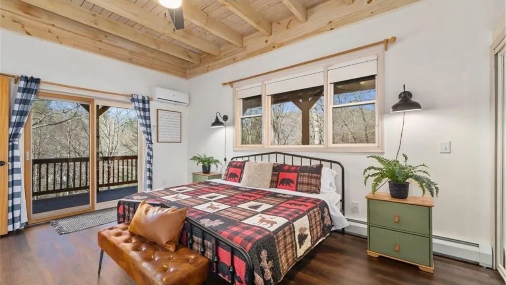 This cozy bedroom blends rustic charm with modern touches, featuring a natural wood ceiling with exposed beams that draw the eye upward. A black metal bed frame is dressed in a playful patchwork quilt, adding warmth and personality. Sliding glass doors and twin windows invite in forest views, while wood accents and greenery soften the space. A leather bench adds a stylish, functional finish to this restful escape.
