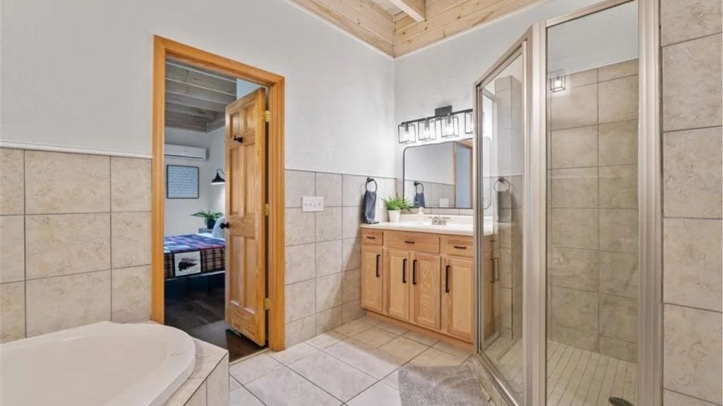 This inviting primary bathroom strikes a perfect balance between comfort and function. Warm wood cabinetry and a soft tile palette create a spa-like feel, while the corner soaking tub and glass-enclosed shower offer options for relaxation. A modern vanity light above the mirror adds a subtle contemporary touch, and the open doorway provides a peek into the adjacent rustic bedroom, tying the spaces together.