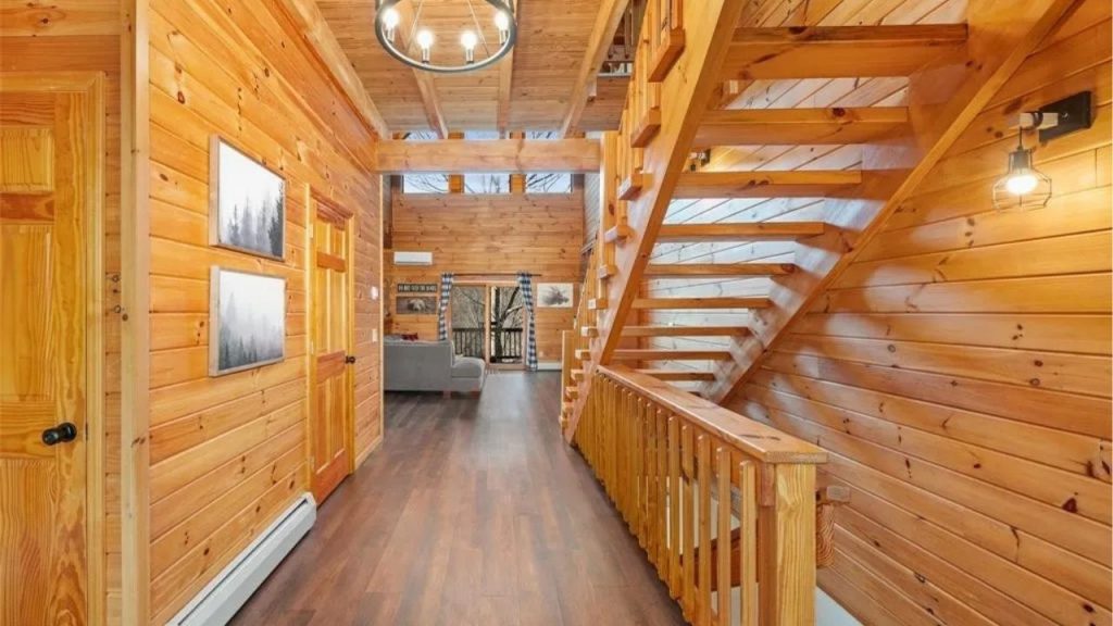 Warm wood tones and open sightlines define this inviting cabin-style interior. A soaring ceiling frames the floating staircase, its clean lines complemented by exposed beams and rustic railings above. The dark front door with an oval glass inset draws focus down the hall, while a gallery wall and console add a personal touch. Modern finishes blend seamlessly with the natural wood, creating a space that feels both cozy and airy.
