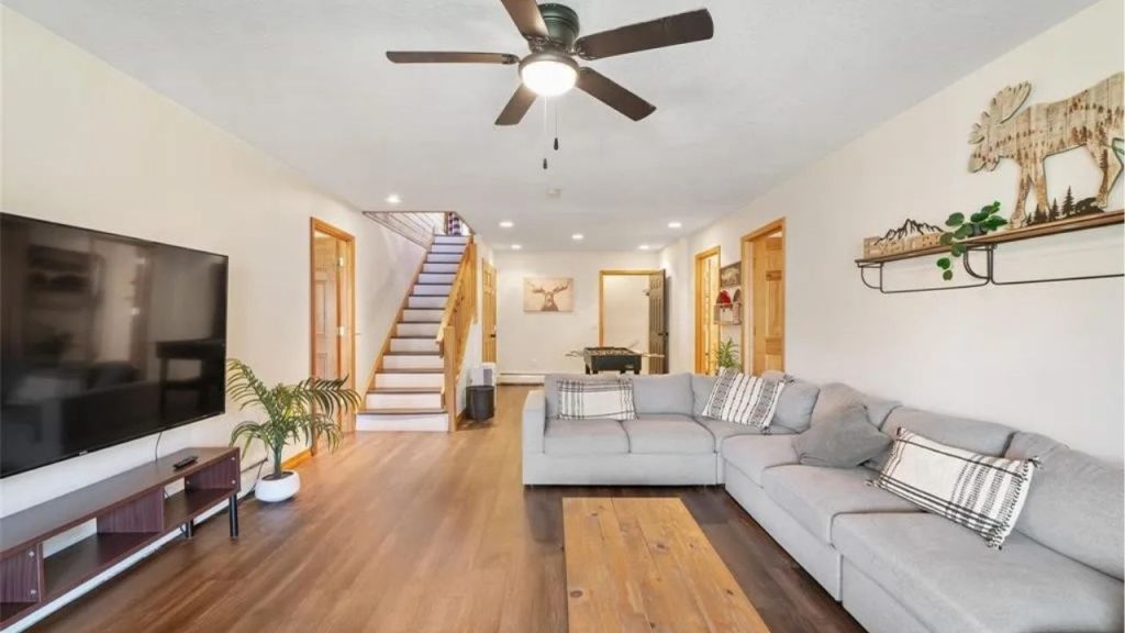 This inviting living room blends comfort and charm with its warm wood accents and soft, neutral palette. A spacious sectional anchors the space, offering the perfect spot to relax beneath recessed lighting and a sleek ceiling fan. Natural wood doors and trim add a touch of rustic appeal, while playful décor—like the moose wall art and open shelf—adds character. A central staircase draws the eye upward, subtly connecting the levels.