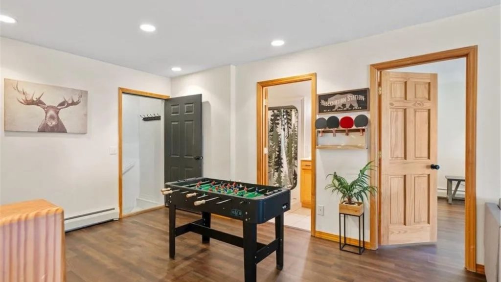 This cheerful game area invites casual fun with a central foosball table set atop rich wood flooring. Framed by natural trim and soft white walls, the space exudes a cozy, lodge-inspired vibe. A ping-pong paddle rack labeled “Hibernation Station” adds whimsy, while potted greenery and wildlife-themed décor complete the look. With easy access to adjacent rooms, this nook balances function and personality effortlessly.