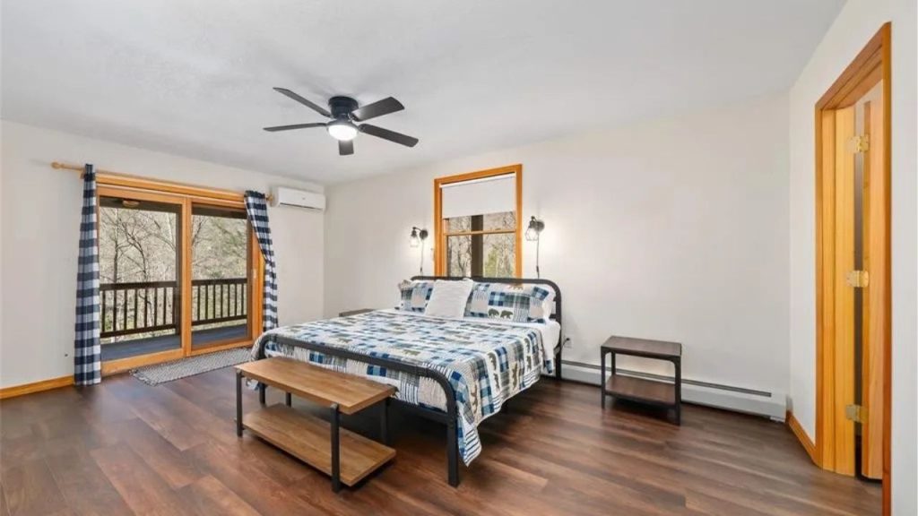 Serene and spacious, this bedroom invites rest with its clean lines and cozy textures. A plaid quilt in cool tones dresses the king-size bed, flanked by black sconces that add a subtle industrial touch. Wide plank flooring and natural wood trim warm the space, while sliding glass doors open to a private balcony overlooking the trees. The minimalist design lets nature take center stage, creating a peaceful retreat.