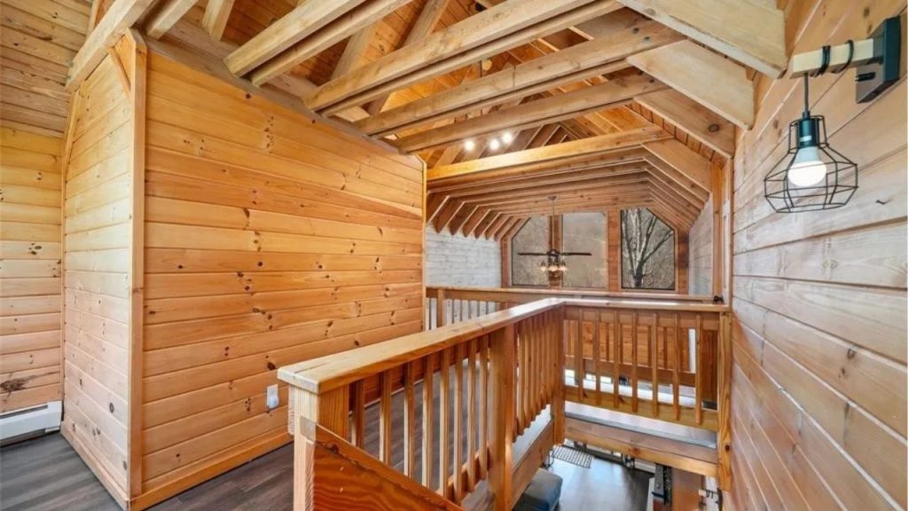 This inviting loft corridor strikes a balance between rustic warmth and architectural interest. Soaring vaulted ceilings reveal natural wood beams, while tongue-and-groove paneling envelops the space in cozy texture. Industrial cage sconces flank the walls, casting a soft glow. An open railing frames the view below, and large windows bring the surrounding forest scene into focus, offering a serene treetop retreat.