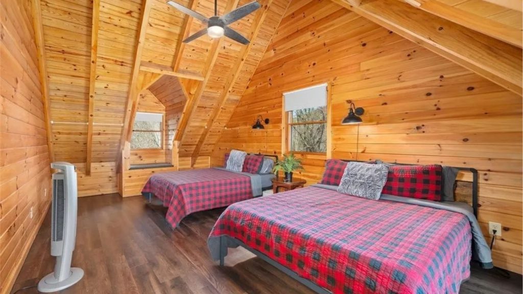 Tucked beneath soaring pine-lined ceilings, this cozy bedroom offers a peaceful sanctuary with a charming cabin feel. Twin beds dressed in plaid evoke rustic comfort, while black metal sconces and a modern ceiling fan add a touch of contemporary edge. A window seat framed by angled beams invites quiet reflection. Warm wood tones and forest views create a tranquil atmosphere, perfect for restful nights and slow mornings.