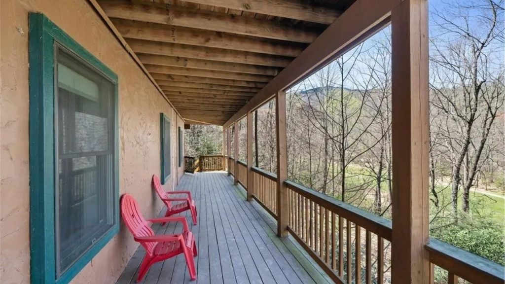 This extended wraparound porch invites quiet moments and panoramic woodland views. Framed by natural wood posts and a sturdy railing, the space feels grounded and timeless. Red Adirondack chairs offer a cheerful contrast to the earthy tones of stucco and forest. Overhead, exposed beams lend rustic charm, while the elevated vantage point makes this the perfect perch for morning coffee or golden hour unwinding.