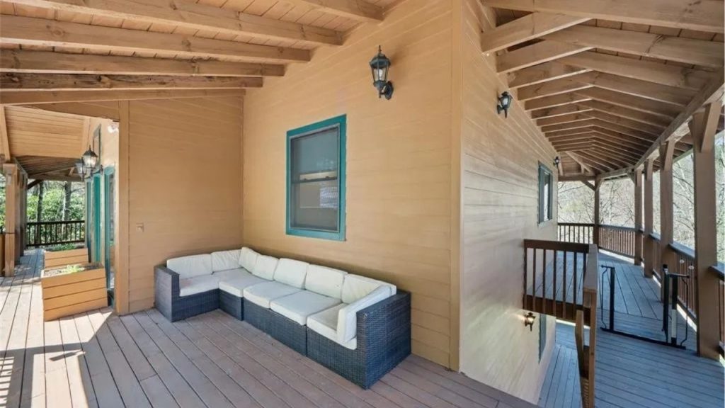 Nestled into the wraparound deck, this inviting nook features a cushioned sectional perfect for lounging beneath the open beams. Framed by sturdy railings and softened by the curve of the home’s exterior, the space balances comfort and structure. Lantern-style sconces add charm and evening glow, while wood tones and forest glimpses create a peaceful retreat for conversation, reading, or simply listening to the wind in the trees.