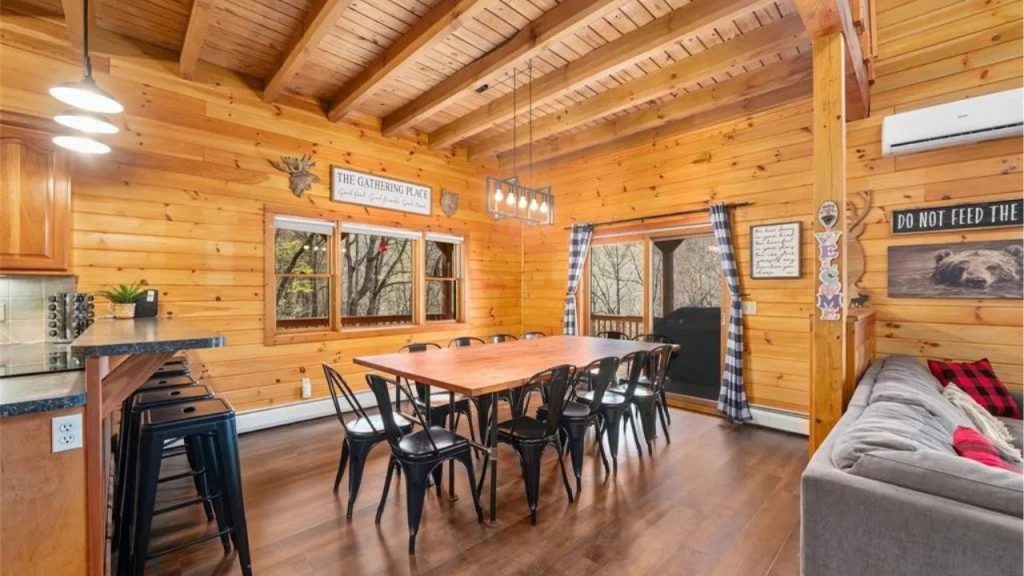 Brimming with character, this dining area invites connection under exposed beams and soft pendant lighting. The natural wood walls and floors echo a timeless cabin feel, while the long farmhouse-style table provides ample space for gatherings. Thoughtful touches like plaid curtains, wall signs, and industrial chairs add personality, creating a cozy, lived-in space that celebrates warmth and togetherness.