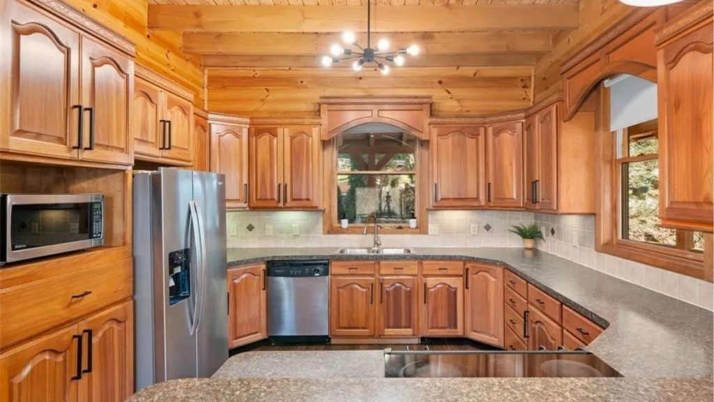 This inviting kitchen balances rustic charm with everyday function. Natural wood cabinetry with rich grain details wraps the space, while black hardware adds subtle contrast. A window above the sink offers a serene view framed by a custom valance, and a modern fixture overhead brings a touch of contemporary style. Granite-look counters and a neutral tile backsplash round out this cozy, well-equipped space.