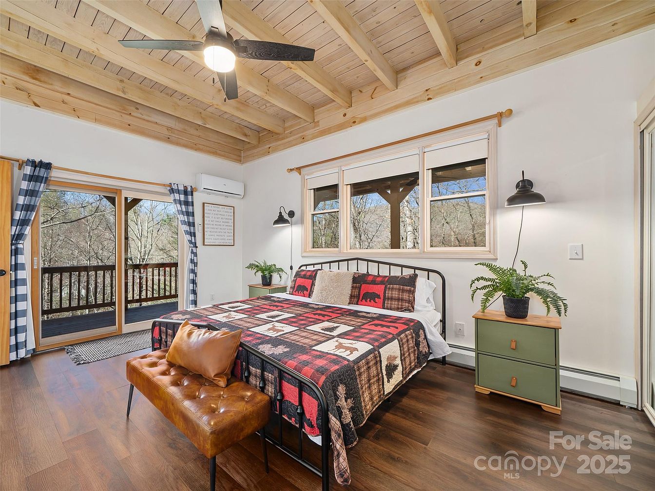This bedroom features a warm, rustic charm with natural wood elements, notably in the exposed beam ceiling and hardwood floors. The bed frame is black metal, complementing a patchwork quilt in earthy tones of red, brown, and cream with nature-inspired motifs like bears and pine trees. Flanking the bed are two green nightstands with wooden tops, each adorned with a potted fern and illuminated by black wall-mounted reading lamps. Large windows and a sliding glass door offer abundant natural light and access to a balcony, highlighted by plaid curtains that add a cozy cabin feel. A stylish tufted leather bench with a matching pillow sits at the foot of the bed, enhancing comfort and style.