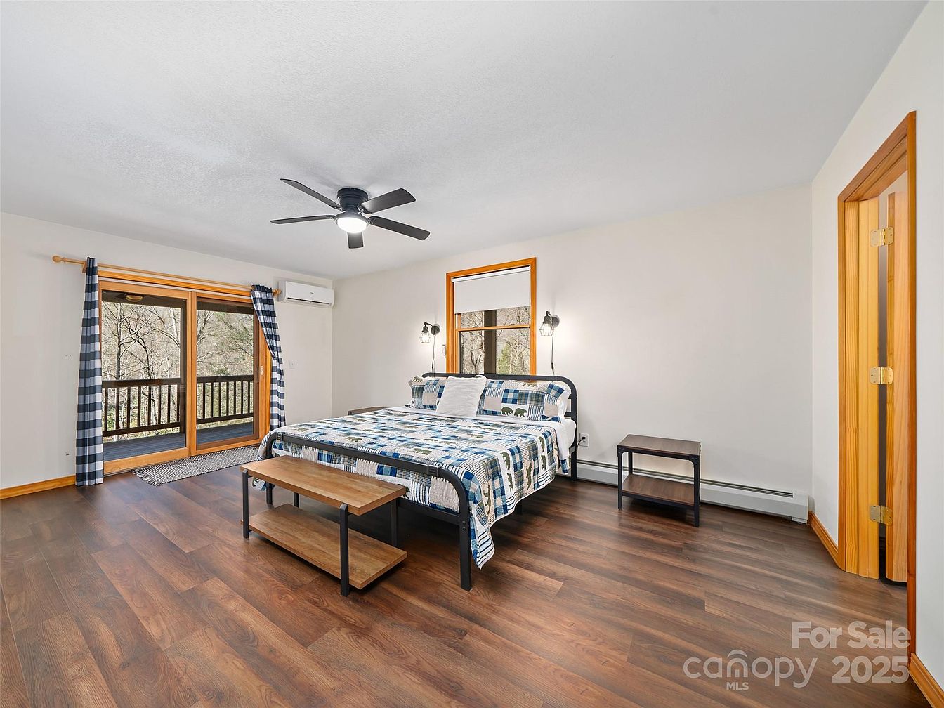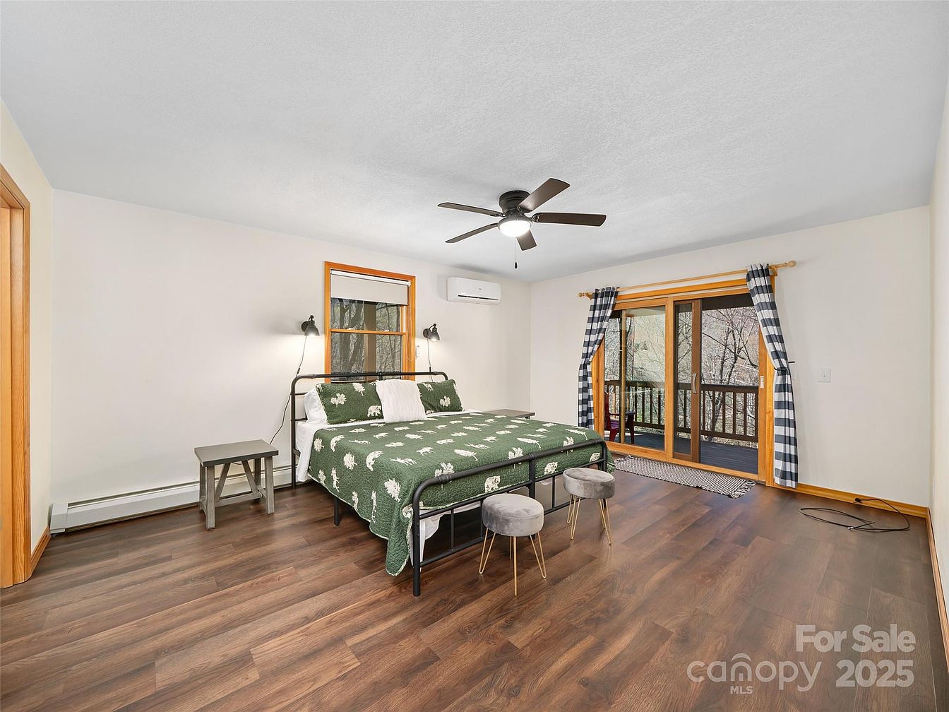 This spacious master bedroom features warm wood flooring that contrasts beautifully with crisp white walls and ceiling. Natural wood trim around the window and sliding glass door adds a rustic charm, enhanced by the dark metal bed frame dressed in a nature-themed green quilt. Beside the bed, minimalist nightstands with modern wall-mounted reading lights create an inviting ambiance. Black and white checkered curtains frame the glass door, leading to an outdoor balcony and bringing in natural light. A ceiling fan provides air circulation, while an air conditioning unit ensures comfort during warmer months, blending functionality with understated style.