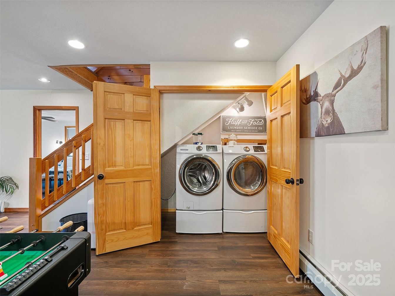 This cleverly designed laundry closet is tucked under the stairway, maximizing space with double wooden bi-fold doors. Inside, a matching front-loading washer and dryer sit side-by-side on a dark wood floor that ties seamlessly with the overall flooring of the area. Above the appliances, a small shelf holds laundry essentials under a trendy “Fluff and Fold” sign, illuminated by dual track spotlights that add warmth and focus. The room’s palette features natural wood tones on the doors and staircase railing, neutral white walls, and accents of rustic charm, including a moose print artwork to the right, creating a cozy, functional nook.