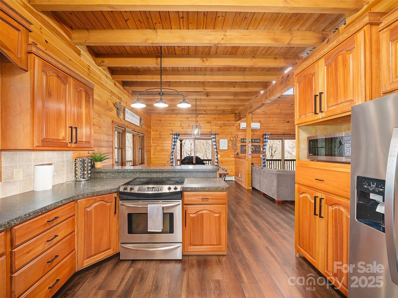 This kitchen features warm, honey-toned wooden cabinetry and paneling that seamlessly blend with the exposed vaulted ceiling beams, creating a rustic yet cozy ambiance. Dark wood laminate flooring adds depth and contrasts with the lighter cabinetry. The kitchen is equipped with stainless steel appliances, including a stove, microwave, and refrigerator, complemented by a dark granite countertop with a raised breakfast bar dividing the kitchen from the open living area. Beyond the kitchen, the living space houses a comfortable gray sectional sofa and large windows draped with checkered curtains, allowing natural light and views of the outdoors. Decorative signs and mounted wooden elements enhance the cabin-like charm.