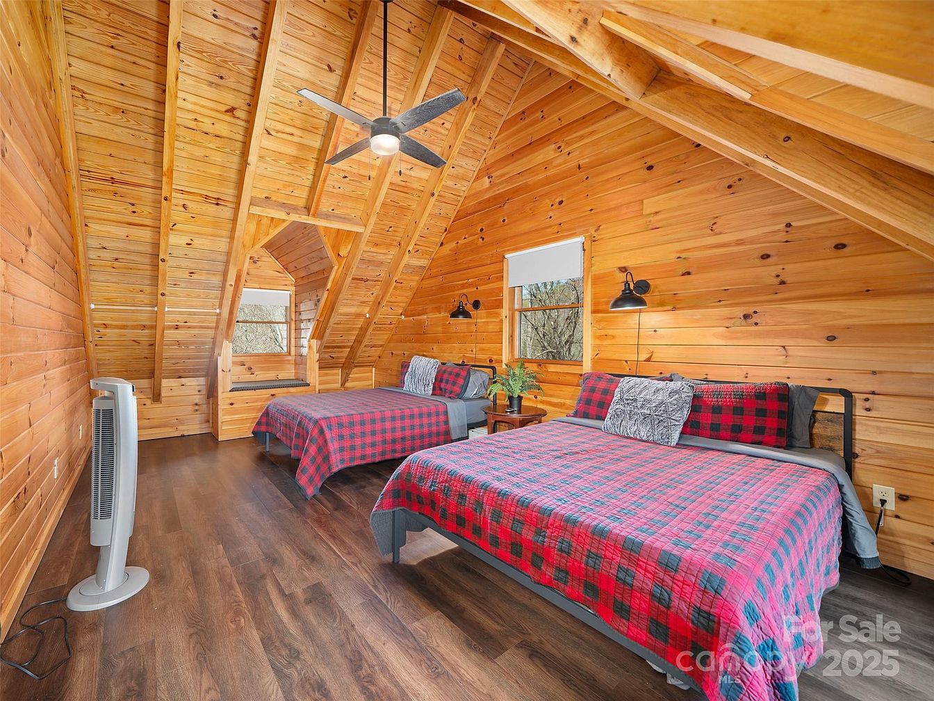 This attic bedroom features warm, honey-toned wood paneling covering the sloped ceiling and walls, creating a rustic and inviting cabin-like ambiance. Two beds dressed in red and black buffalo plaid bedding face a small wooden nightstand with a potted plant, enhancing the cozy atmosphere. A sleek ceiling fan hangs centrally, offering ventilation without disrupting the room’s minimalist aesthetic. The rich, dark wood floor contrasts beautifully with the lighter wood tones on the walls, while two black wall sconces provide focused lighting. A small window seat tucked into the gable provides a charming nook with natural light.