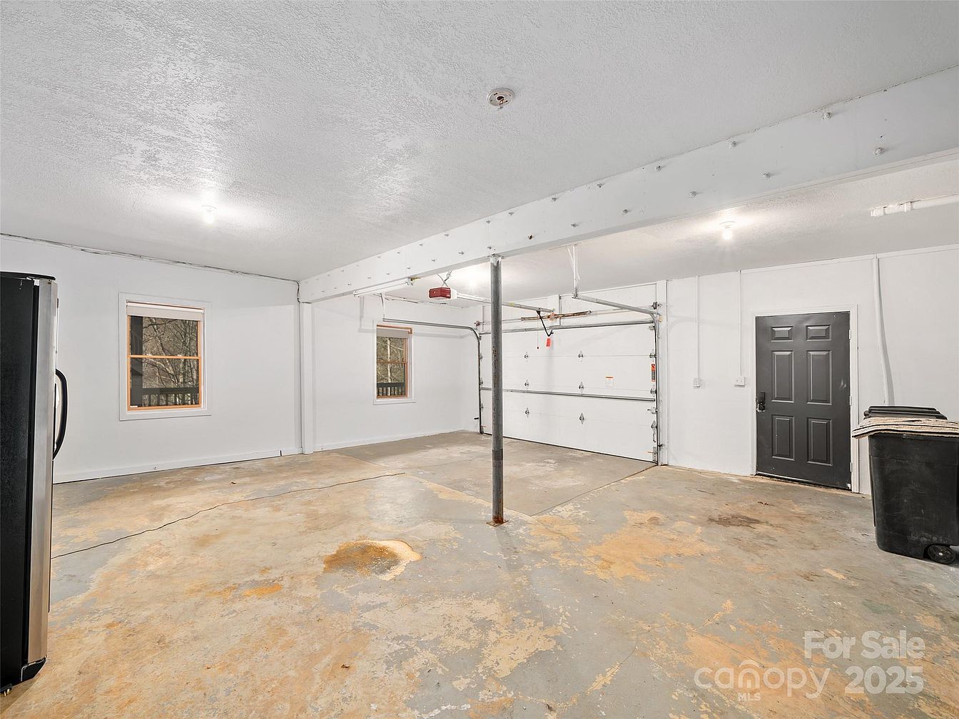 This spacious garage features a utilitarian design with a focus on functionality. The concrete floor shows signs of wear with visible stains and cracks, indicative of heavy use. The walls and ceiling are painted white, brightening the space and enhancing its openness. Two windows bring in natural light while the white overhead garage door provides access for vehicles. A supporting beam and metal post run through the center, ensuring structural stability. A black, six-panel door leads to the interior of the home, contrasted against the white walls. The space is lit by simple ceiling-mounted bulbs, and a black trash bin sits near the doorway, suggesting practical storage use.