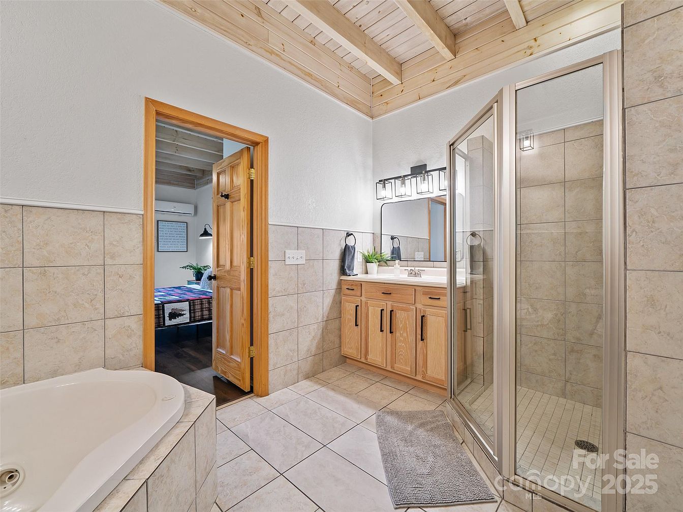 This master bathroom blends natural wood and tiled surfaces for a warm, inviting feel. A corner soaking tub is framed by beige stone-like tiles that extend halfway up the walls. Across from the tub, a wooden vanity with black hardware supports a white sink basin and a large rectangular mirror, illuminated by a contemporary four-light fixture with glass shades. The shower features a glass enclosure with matching tile floors and walls. Natural wood beams and slats form the ceiling, creating a rustic yet polished ambiance. A wooden door leads to a bedroom with dark flooring and cozy textiles, linking the spaces seamlessly.