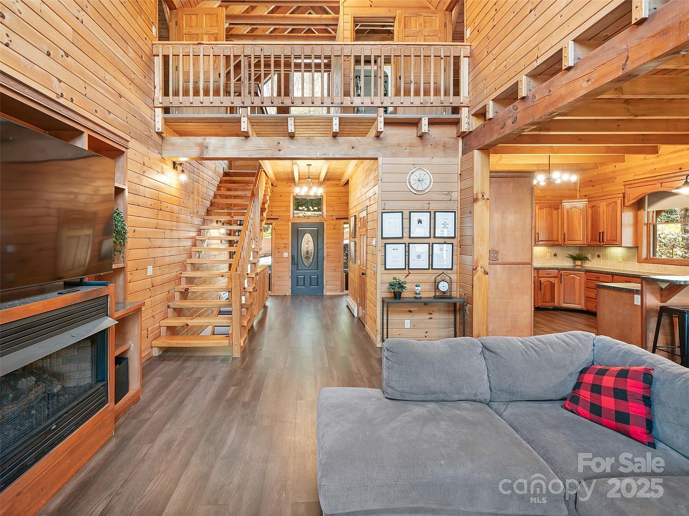 This inviting open living space features rich, honey-toned wood paneling on the walls and ceiling, evoking a warm, rustic cabin feel. The layout is open-concept, allowing seamless flow from the cozy living area, anchored by a large gray sectional sofa with a red plaid accent pillow, to the kitchen with natural wood cabinetry and granite countertops. The cathedral ceiling boasts exposed wood beams and a loft with simple railing overlooking the main floor. A modern staircase with wooden treads and minimal railing leads upstairs. The entry door, painted a deep muted blue, acts as a subtle focal point down the hardwood corridor. This space blends rustic charm with modern comfort through natural textures and open airy design.
