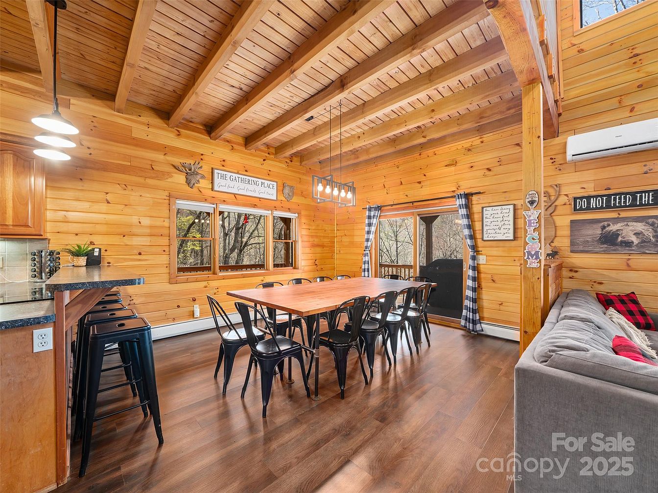 This cozy dining area features rich wood-paneled walls and a vaulted ceiling with exposed beams, creating a rustic cabin ambiance. A long rectangular wooden table is surrounded by sleek black metal chairs, ideal for large gatherings. Adjacent to the dining space, a partial kitchen counter extends with matching black bar stools, seamlessly integrating the kitchen and dining zones. The room is brightened by modern pendant lighting fixtures, and the large windows and glass door with checkered curtains let in natural light while offering views of wooded surroundings. On the right, a gray sofa adorned with red and plaid cushions adds a comfortable seating option beside playful wall art and welcoming decor pieces.