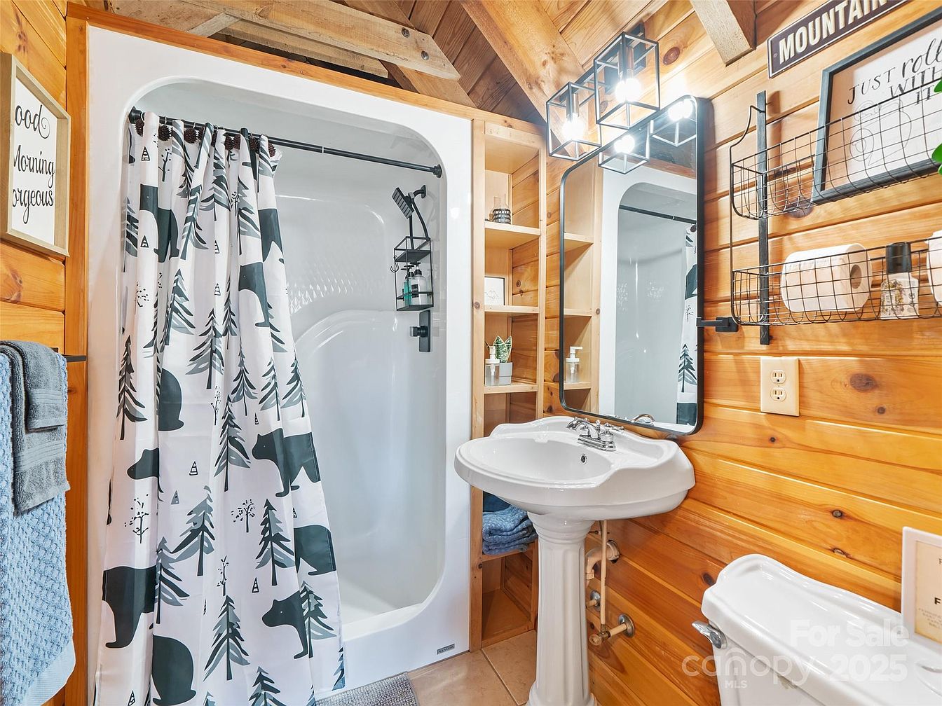This cozy bathroom embraces a rustic cabin vibe with warm, honey-toned wood-paneled walls that add natural texture and charm. The space features a compact corner shower with a curved white enclosure, enhanced by a playful shower curtain patterned with black bear silhouettes and evergreen trees. A classic white pedestal sink and a traditional toilet complete the fixtures. Above the sink hangs a rectangular mirror framed in black, flanked by minimalist industrial-style lighting with exposed bulbs encased in black geometric cages. Open shelving beside the sink provides neat storage, while a black wire wall-mounted rack organizes toiletries and paper goods, all contributing to a functional, inviting mountain-inspired aesthetic.