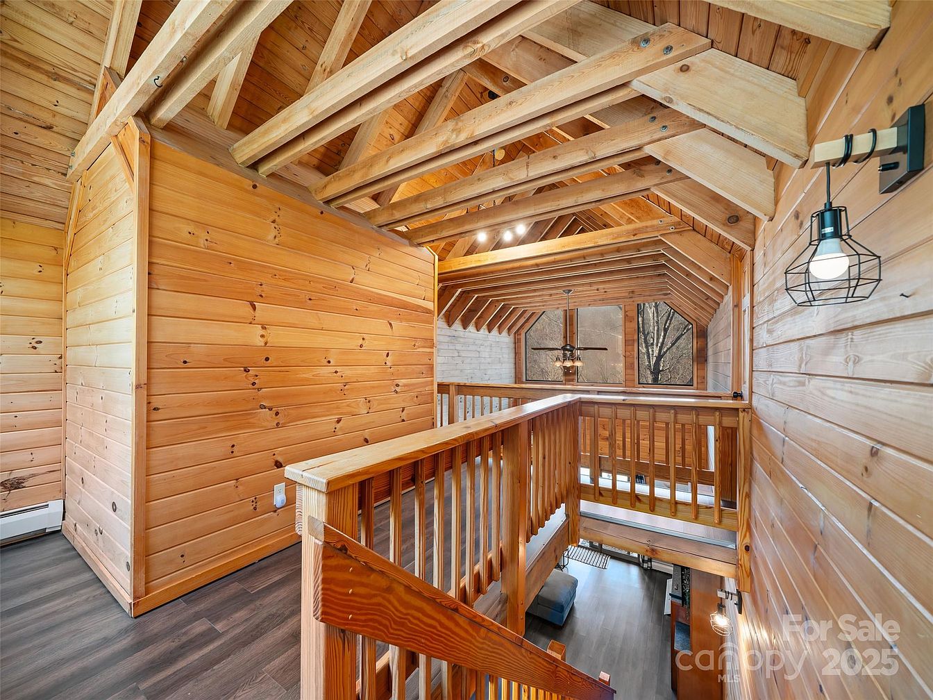 This charming loft area features natural wood paneling and exposed timber beams that evoke a cozy cabin atmosphere. The open railing design overlooks the living room below, emphasizing an airy, open-concept feel. Light wood tones dominate the space, harmonizing with the rustic architectural details like the peaked ceiling and visible trusses. Paired with dark flooring that adds contrast, this loft combines warmth and modernity. Industrial-style wall sconces provide lighting while maintaining a minimalist, functional aesthetic. Large windows at the far end flood the space with natural light and offer serene views of the surrounding nature outside.