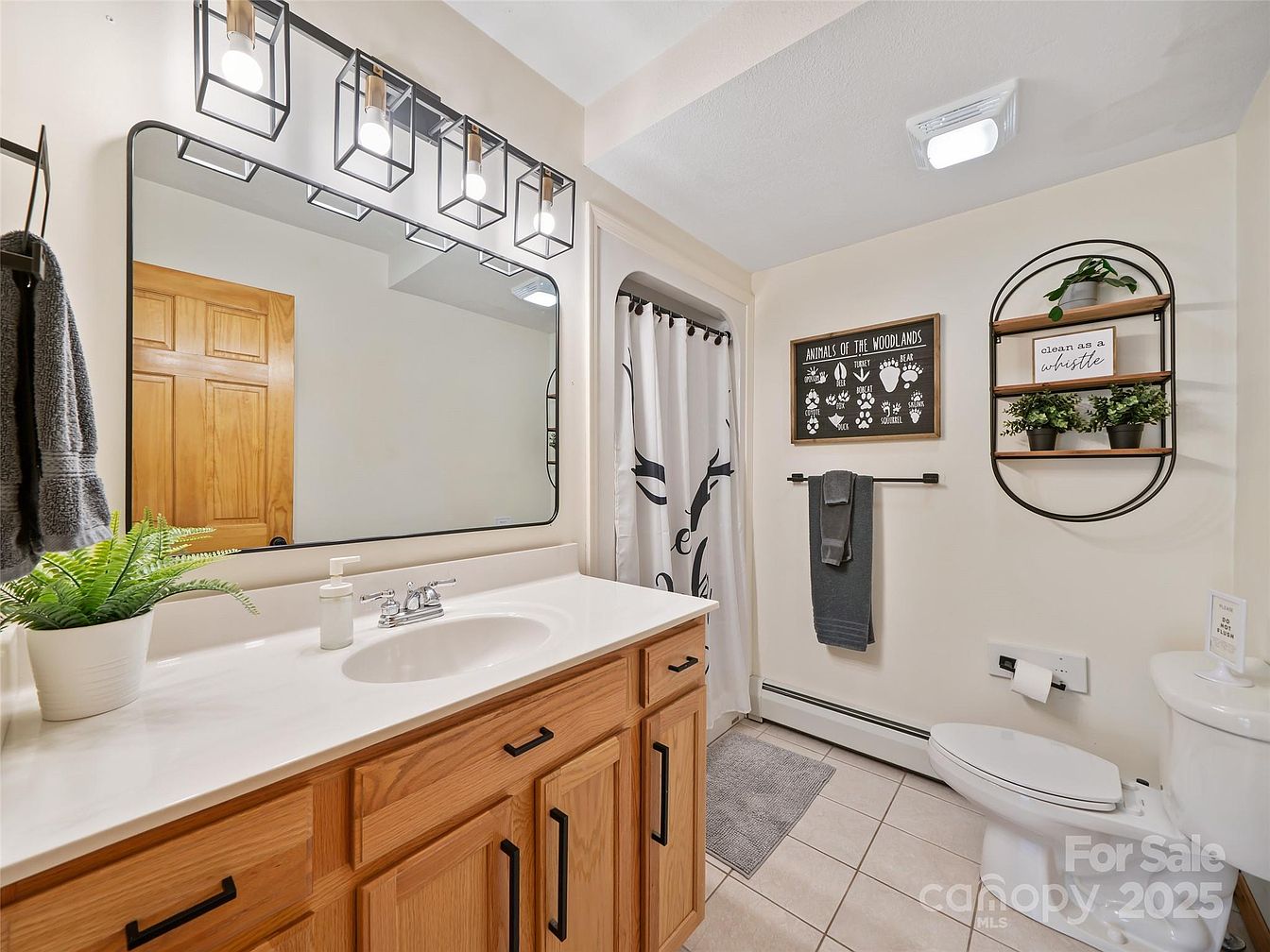 This bathroom features a classic and clean design with a warm wood vanity contrasted by black hardware. The countertop is a smooth, light surface with a built-in sink, complemented by a large rectangular mirror framed with rounded edges. Above, modern cage-style light fixtures with exposed bulbs enhance the brightness. The tiled floor is a subtle beige, coordinating with the light walls, which create a spacious feel. Decorative elements include a small potted fern, a framed “Animals of the Woodlands” print, and a black metal wall shelf holding greenery and a “clean as a whistle” sign, adding a touch of nature and charm. The shower curtain bears a bold black pattern, and plush gray towels and rugs introduce soft neutral tones for added comfort.