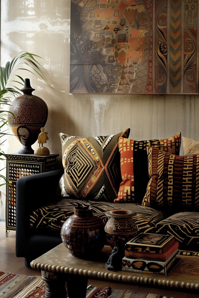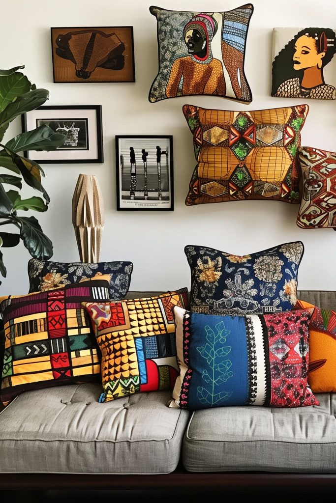 Pillows are an easy way to incorporate African-inspired prints and patterns into your decor. Mix and match throw pillows in bold colors and geometric designs to add visual interest to your sofa, bed, or accent chairs. Look for pillows made from natural fibers like cotton or linen for a soft and comfortable feel.