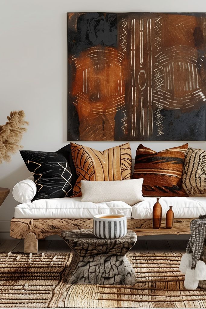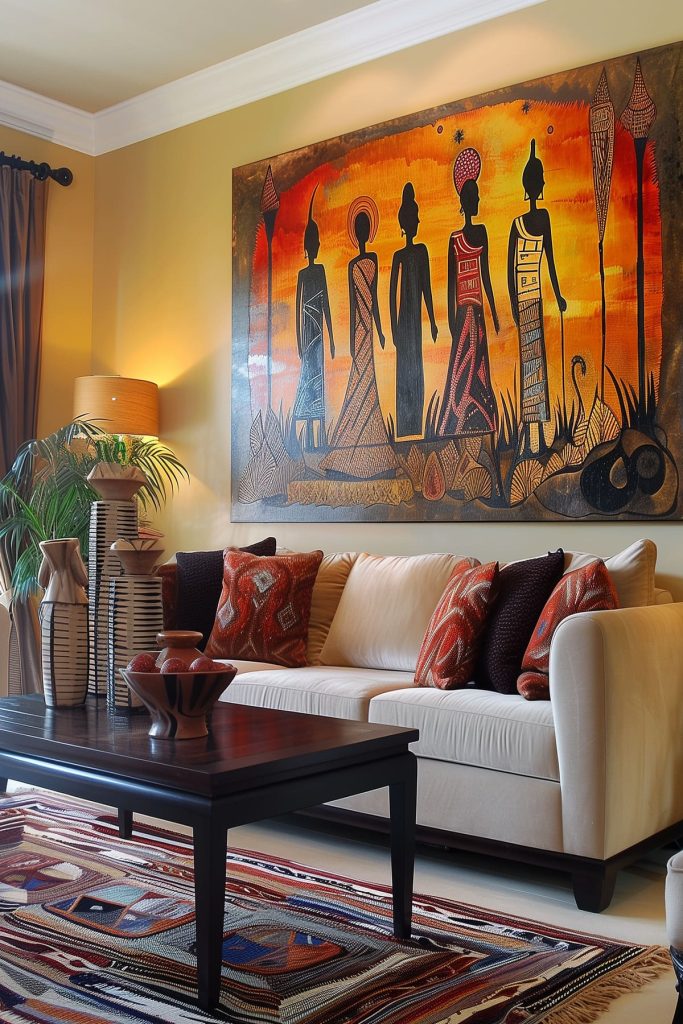 Make a statement with bold, oversized artwork that celebrates African culture. Look for paintings or prints featuring scenes of African landscapes, wildlife, or traditional ceremonies.