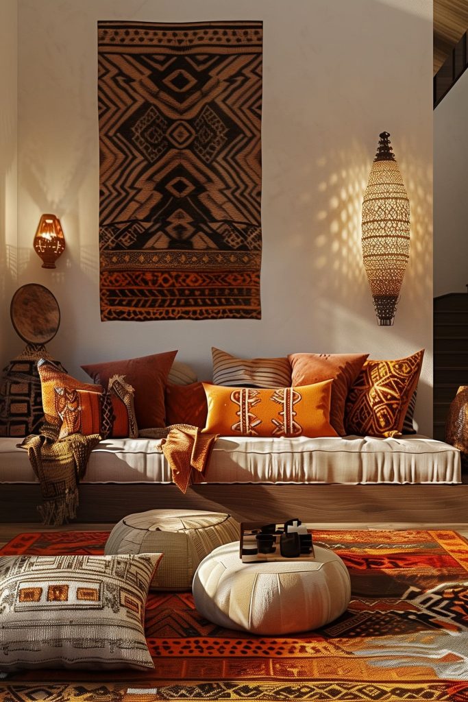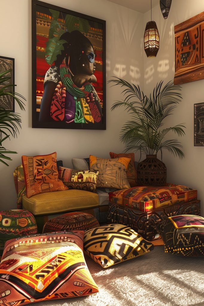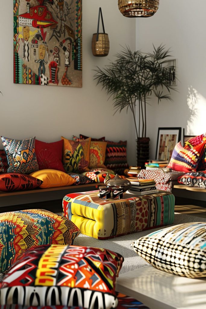 : Low seating options like floor cushions, poufs, and ottomans create a relaxed and casual atmosphere in any room. Arrange a mix of floor cushions in vibrant African prints around a low coffee table for an inviting seating area.