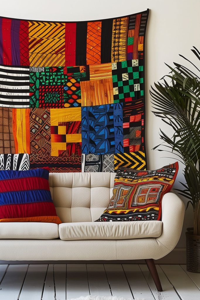Kente cloth, traditionally woven in Ghana, can be displayed as wall hangings or used as table runners to add a pop of color to any room. Mud cloth, with its earthy tones and geometric designs, is perfect for throw pillows or as a unique wall tapestry.