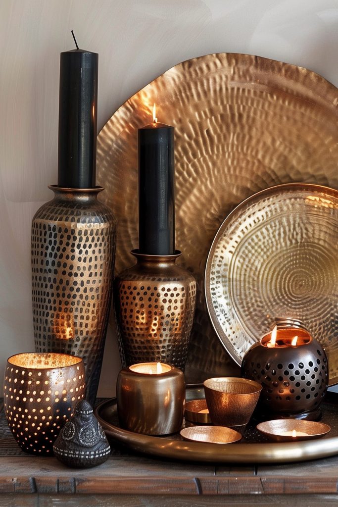 Brass and copper accents add warmth and sophistication to Afrohemian decor. Look for brass candle holders, copper vases, or hammered metal trays to incorporate metallic elements into your space.
