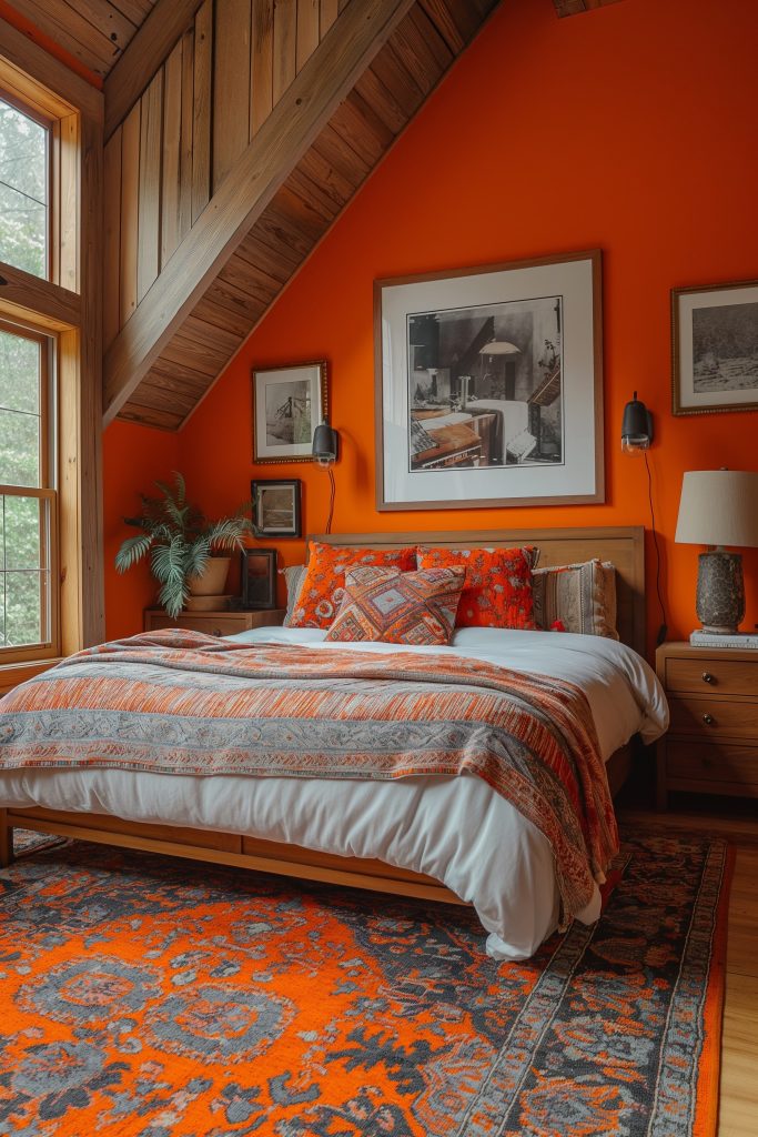 Step into a vibrant symphony of energy in this attic bedroom, where a bold orange palette and intricate patterns dance across the walls. Artistry takes center stage as captivating paintings adorn the room, their vibrant hues and expressive strokes echoing the room’s dynamic spirit.