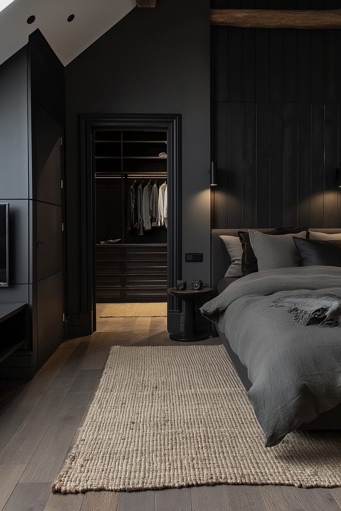 Step into the epitome of modern masculinity with this attic bedroom, where a bold black color scheme exudes sophistication and power. Sumptuous furnishings, including a rectangular bed, a large natural rug and a wardrobe, accentuate the room’s elegance, while minimalist modern décor complements the edgy aesthetic, creating a harmonious blend of style and substance.