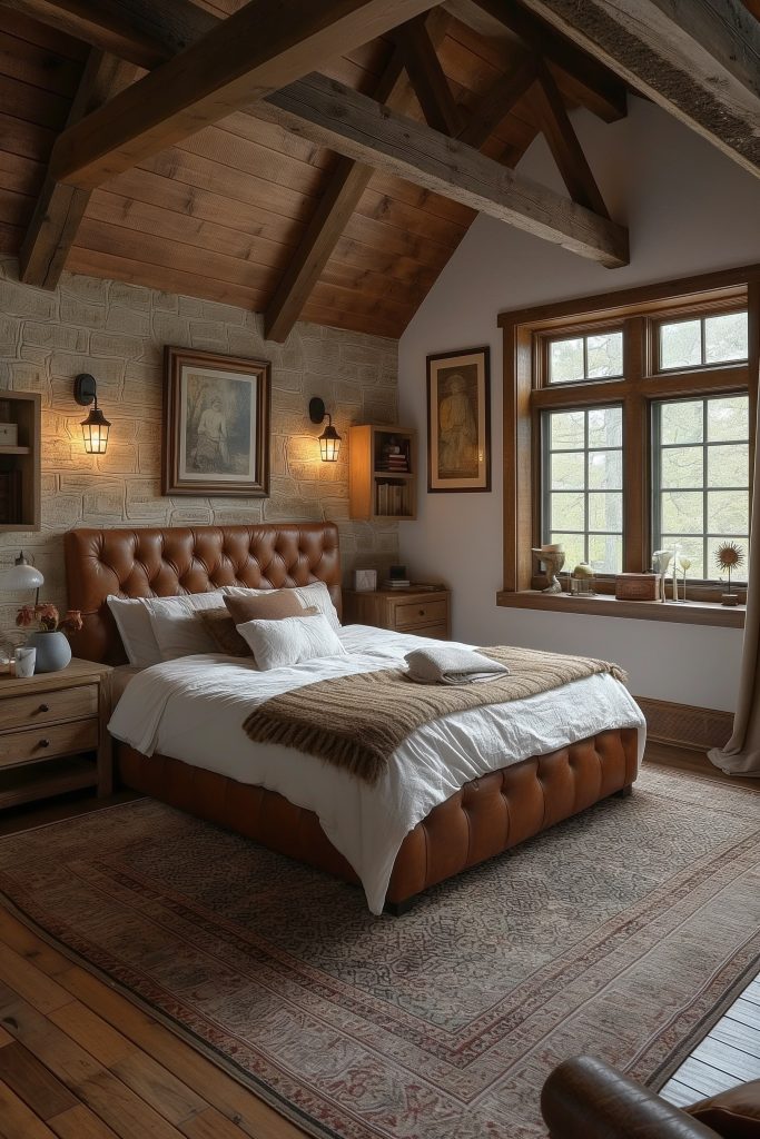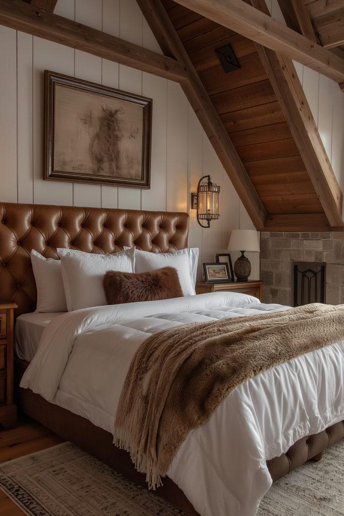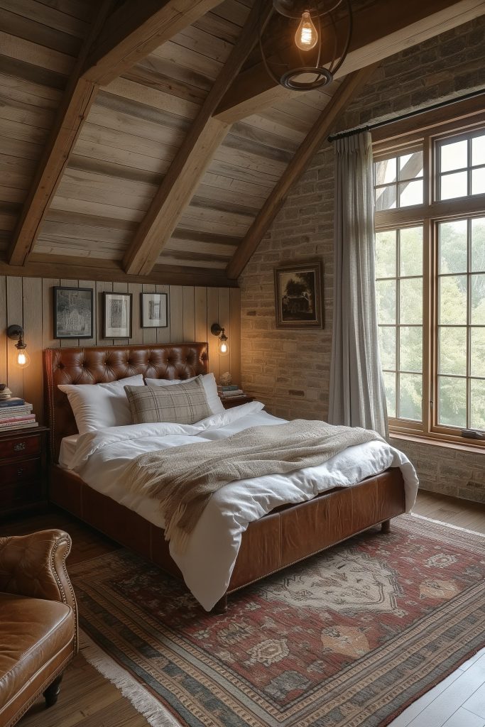 Embrace a harmonious blend of classic European elegance and modern and classic sensibilities in this exquisite attic bedroom. Wood and brick elements intertwine seamlessly, creating a captivating contrast. A plush leather bed and soft linens invite relaxation, while warm lighting from antique lamps sets a cozy and inviting ambiance.