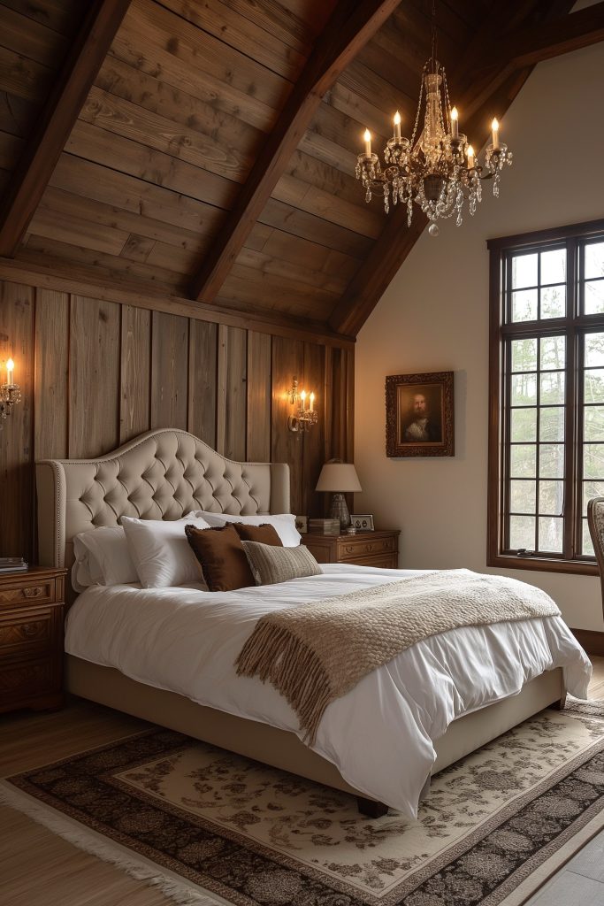 Step into a haven of timeless elegance, where classic grandeur meets modern sensibilities in this exquisitely appointed attic bedroom. Bathed in the rich hues of dark wood, the room exudes an aura of sophistication, adorned with antique chandeliers, and a grand king-sized bed. This harmonious blend of traditional and contemporary elements creates a truly unique and unforgettable experience.