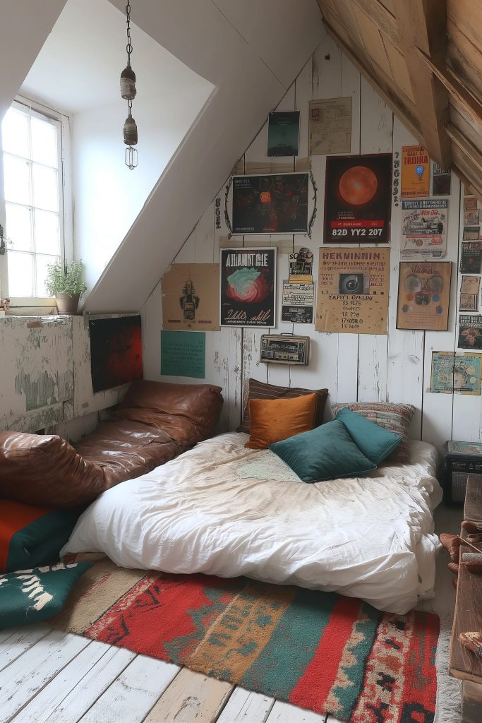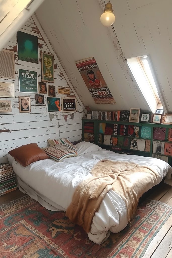 Embrace the edgy charm of grunge in this attic bedroom, where a riot of colors and textures exudes a rebellious and energetic vibe. A jumble of books, rugs, and posters creates a sense of creative chaos, while the plush bed beckons relaxation and comfort.