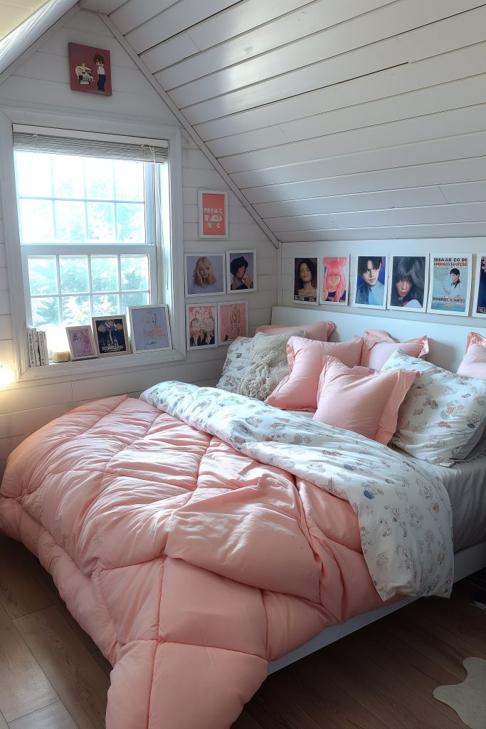K-Pop enthusiasts, rejoice! This adorable attic bedroom is a haven for all your idol obsessions. Vibrant posters of your favorite Korean stars adorn the walls, adding a touch of personality and excitement to the space. A cheerful blend of pink and white hues creates a playful and inviting atmosphere, while the minimalist design ensures a clutter-free and airy retreat.