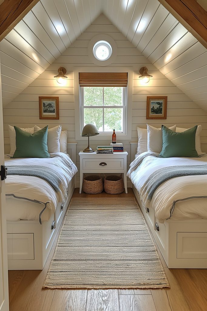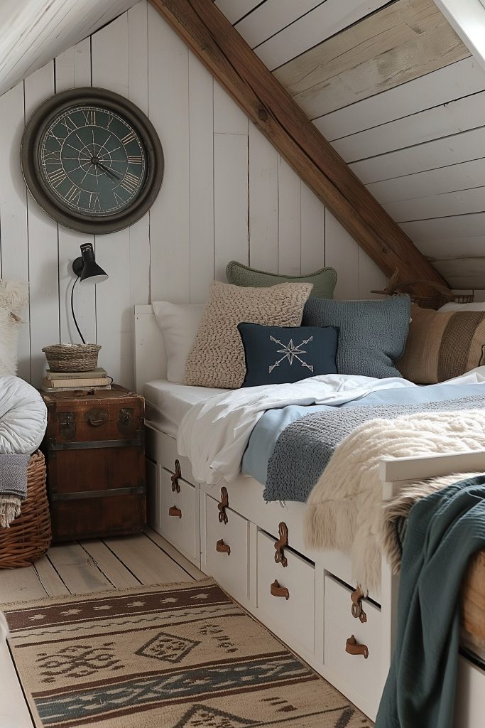 Embark on an adventurous voyage in this attic bedroom, where a captivating blend of white, brown, and blue hues evokes the spirit of a ship at sea. Classic nautical accents like a compass-shaped clock and treasure chest-turned storage trunks add a touch of whimsy, while the overall design sparks the imagination of young explorers.