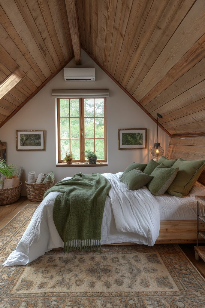 Immerse yourself in the embrace of nature’s tranquility in this attic bedroom, where wooden accents and verdant hues create a harmonious haven. Bathed in the soothing tones of sage green, the room features lush potted plants and expansive windows that invite sunlight to dance across the natural wood furnishings, fostering a sense of serenity and connection with the outdoors.