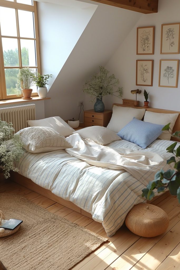 Embrace the refreshing allure of the Mediterranean in this attic bedroom, where light wood accents harmonize with crisp white and soothing blue linens. Adorned with vibrant potted plants and graced with simple wall art, the space exudes an aura of effortless elegance, inviting tranquility and rejuvenation.