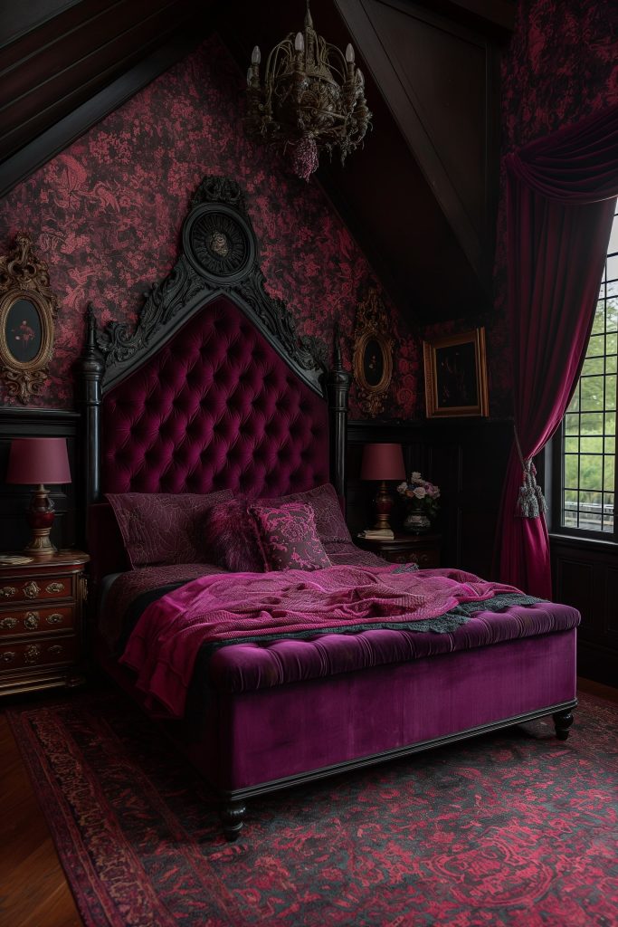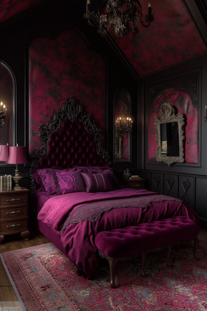 Step into a realm of Gothic grandeur in this opulent castle bedroom, where a symphony of darkness and purple hues unfolds amidst an air of timeless elegance. Adorned in rich crimson and ebony, the space exudes an aura of mystery and sophistication.