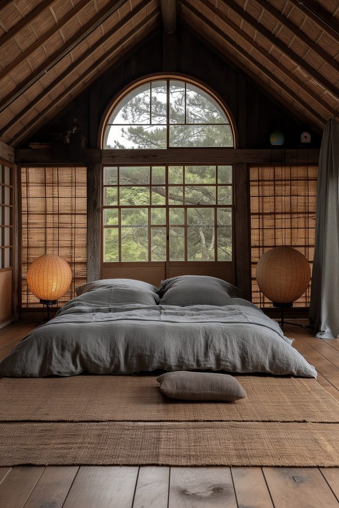 Embrace the serenity of traditional Japanese minimalism in this attic bedroom, where natural wood elements evoke a sense of tranquility and harmony with nature. The uncluttered space features a simple gray bed and a nightstand lamp, fostering a meditative ambiance. A window frames a refreshing view of a pine forest, inviting tranquility and connection to the natural world.