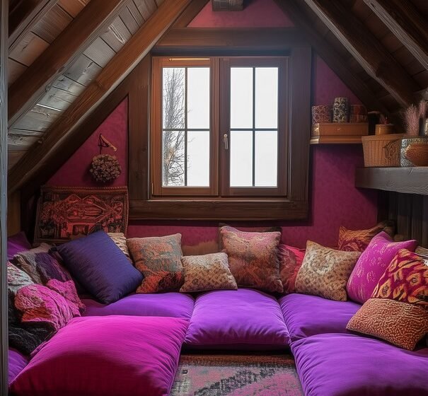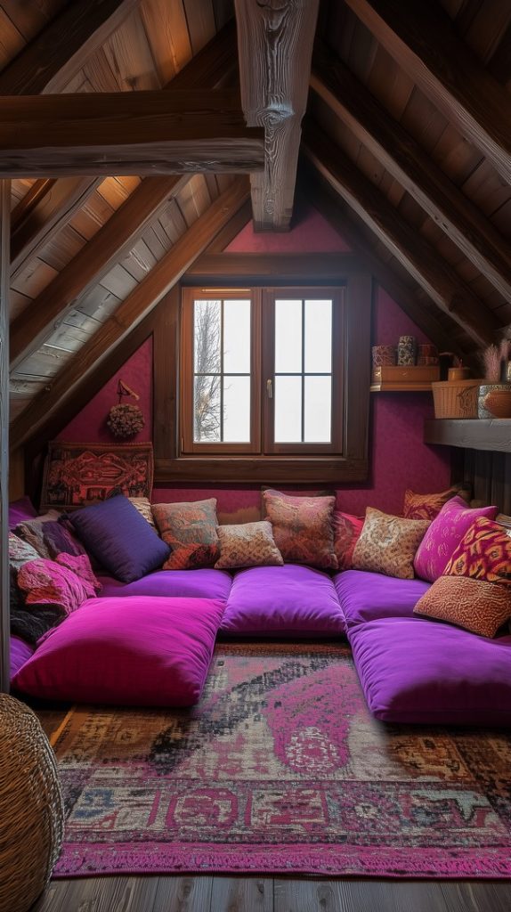 This vibrant attic space uses rich colors and plush seating to create a Moroccan-inspired retreat. It’s a perfect space for unwinding in a cozy, eclectic setting.
